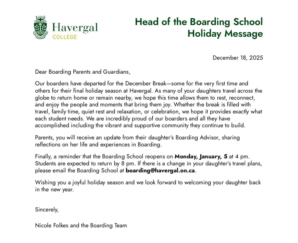 Families with a student currently in grades 7 and 9 interested in applying to the program for the 2026-27 school year are invited to an information session at Havergal on Monday, February 9, from 6-7 pm in the Brenda Robson Hall. The information session is a required component of the application process, as it’s important that the applying student and at least 1 parent/guardian attend to understand the program they are applying for.