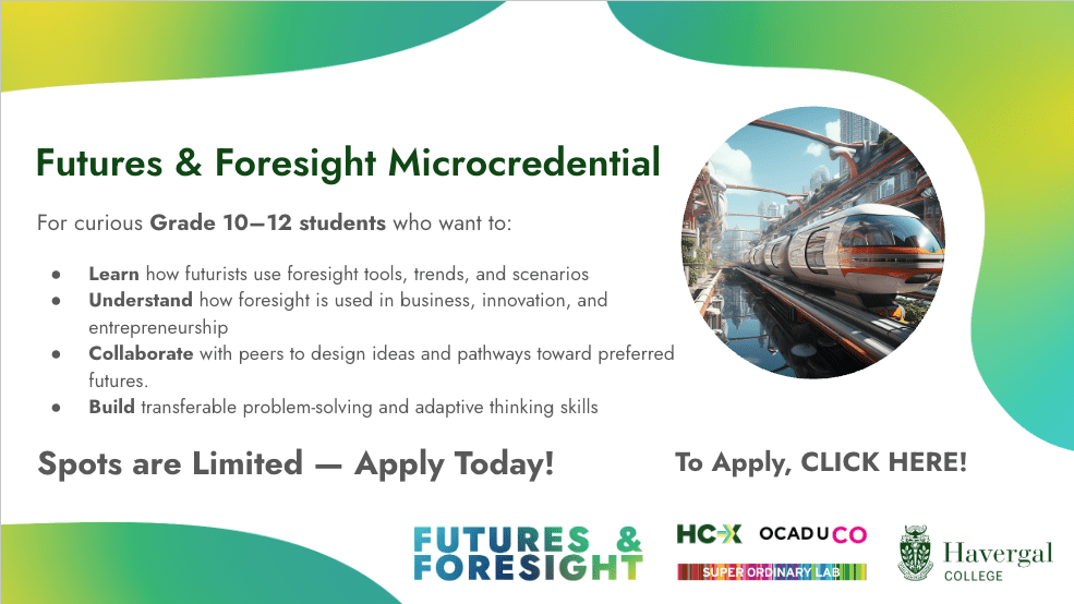 Interested in Business, Entrepreneurship, Design or Innovation? The Futures & Foresight Microcredential is a new learning opportunity designed in partnership with OCAD for students in Grades 10–12.